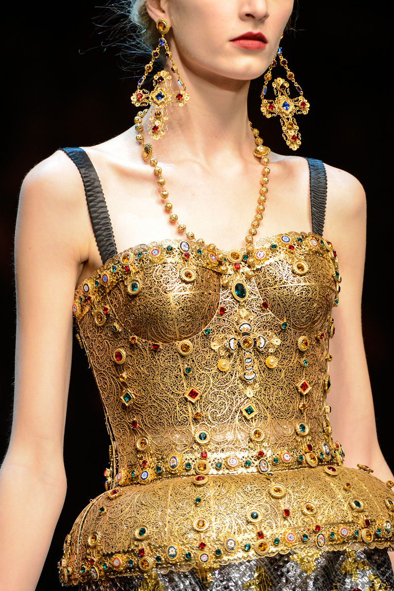 Opulence and extravaganza has been seen quite a lot this past seasons on the runways. Is it a consequence of the global economical crisis, a way to fight austerity ? What is sure is that the designers want to make us dream and travel trough time, weather it's with Balmain's fully embroidered, beaded floral armor like jackets and mini dresses or Dolce Gabbana's Byzantine splendor inspired collection.